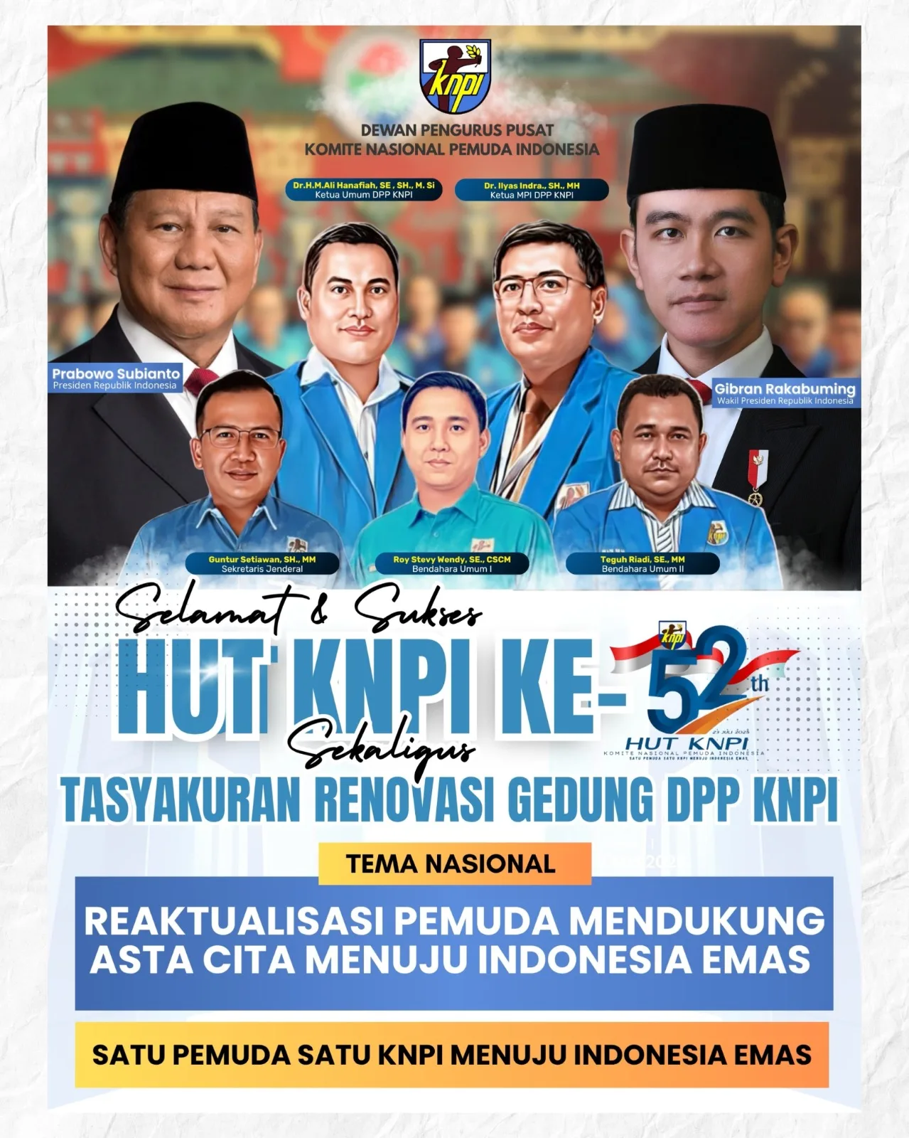 Jakarta, Djawaranews.com – Perayaan HUT KNPI ke-52 tahun ini mengangkat tema “Reaktualisasi Pemuda Mendukung Asta Cita Menuju Indonesia Emas” dengan semboyan nasional “Satu Pemuda Satu KNPI Menuju Indonesia Emas”.