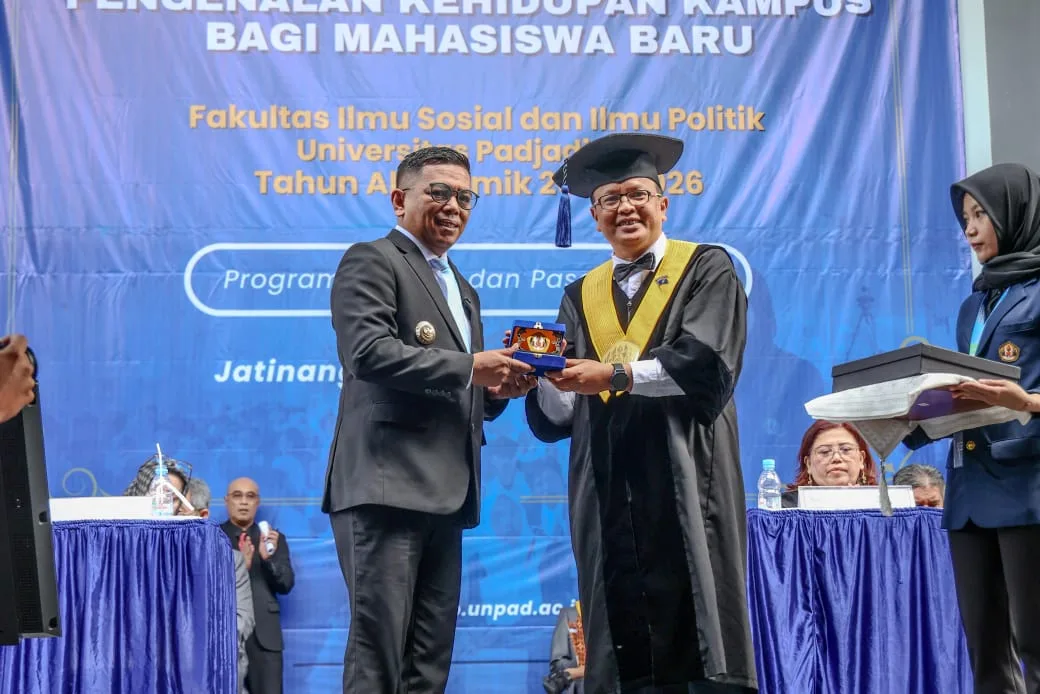 PKKMB Fisip Unpad Tahun Akademik 2025/2026 dipimpin Dekan Fisip Unpad Prof. Dr. Mohammad Benny Alexandri diiukuti seluruh mahasiswa baru Fisip Unpad dalam Sidang Terbuka Senat Fisip Unpad. Hadir dalam kesempatan tersebut Wakil Ketua Majelis Wali Amanat Prof. Dr. Arry Bainus, Wakil Rektor Unpad Prof. Dr. R Widya Setyabudi Sumadinata serta para Wakil Dekan Fisip Unpad. (One)